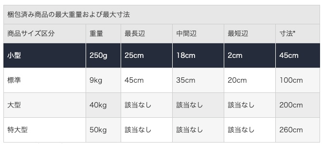 納品先のフルフィルメントセンターは、以下の在庫分散の商品サイズ区分(FBA手数料のサイズ区分とは異なります)に基づいて、納品の都度、変更されることがあります。