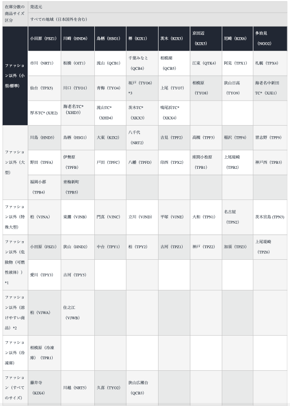 上記の表は、各フルフィルメントセンターが対応している商品のタイプとサイズを示しています。